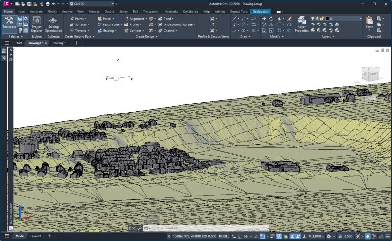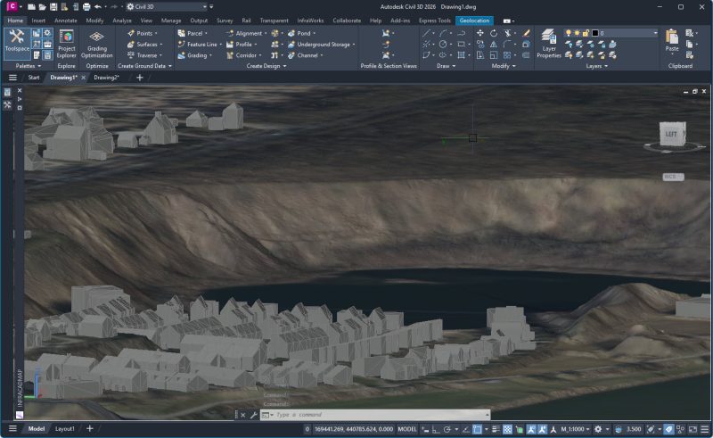 Wil je het nog mooier maken, importeer dan ook de luchtfoto van het gebied met InfraCAD Map. Deze kun je met Civil 3D functionaliteit draperen over de Surface waardoor je een realistischer beeld van het terrein kunt tonen.
